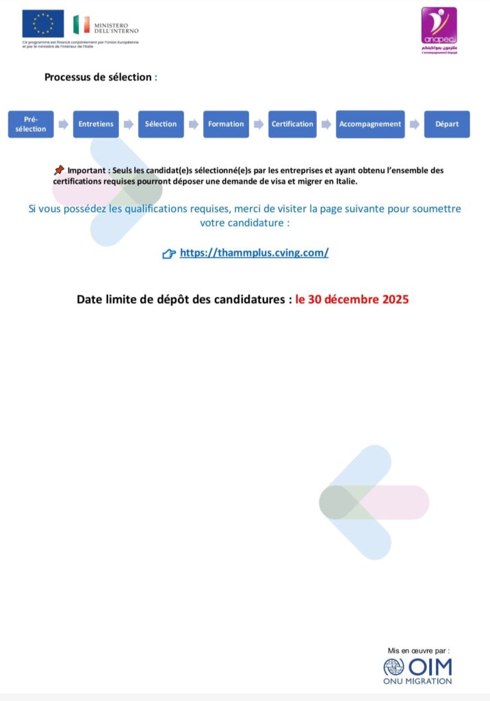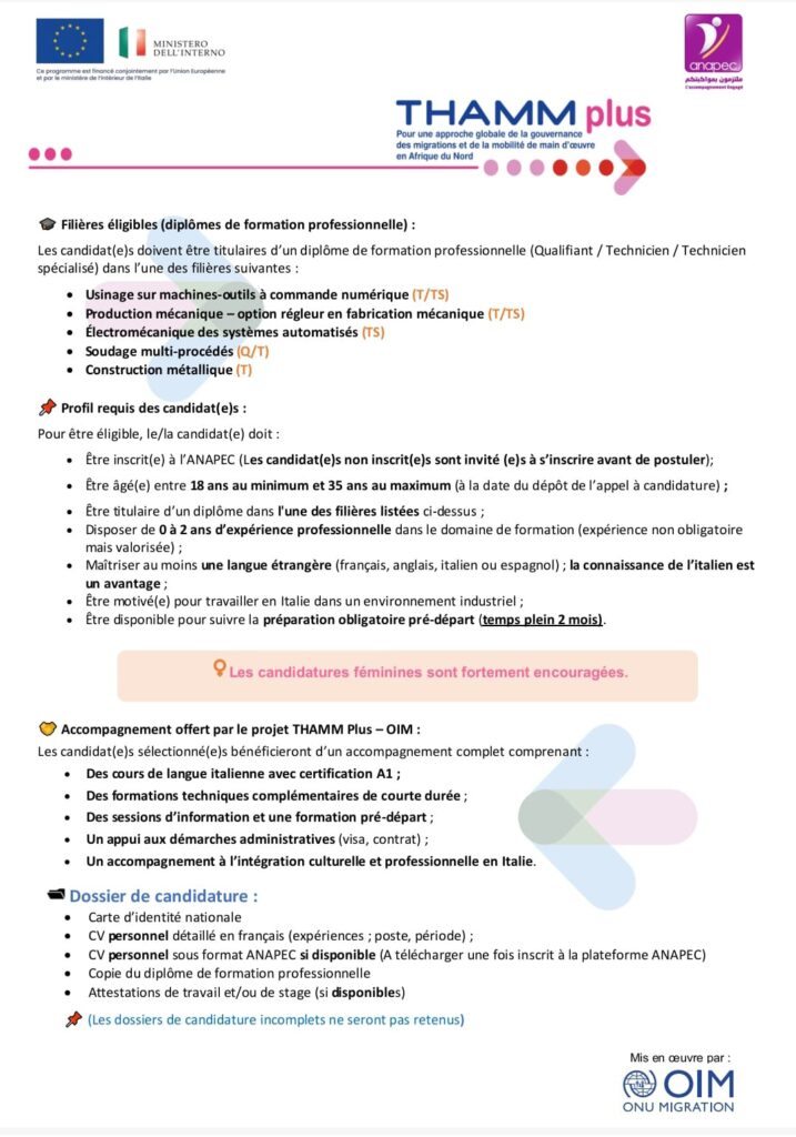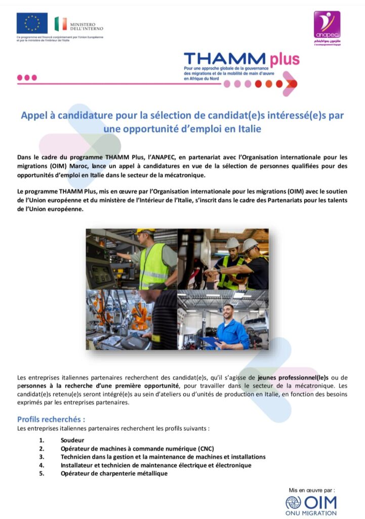 Dans le cadre du programme THAMM Plus, l’ANAPEC, en partenariat avec l’Organisation internationale pour les migrations (OIM) Maroc, lance un appel à candidatures en vue de la sélection de personnes qualifiées pour des opportunités d’emploi en Italie dans le secteur de la mécatronique.