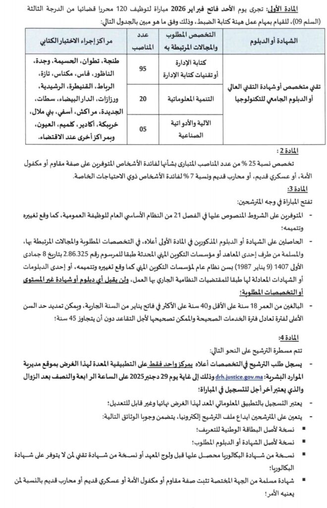 Le Concours de recrutement des Rédacteurs Judiciaires de 3ème grade – Échelle 9 organisé par le Ministère de la Justice du Maroc représente l’une des opportunités les plus importantes de l’année 2026 pour les candidats souhaitant intégrer la fonction publique marocaine. Avec 120 postes ouverts, un recrutement régulier, et des spécialités variées, ce concours attire chaque année des milliers de candidats issus de la formation professionnelle et technique.