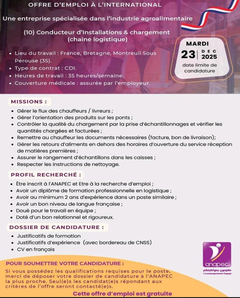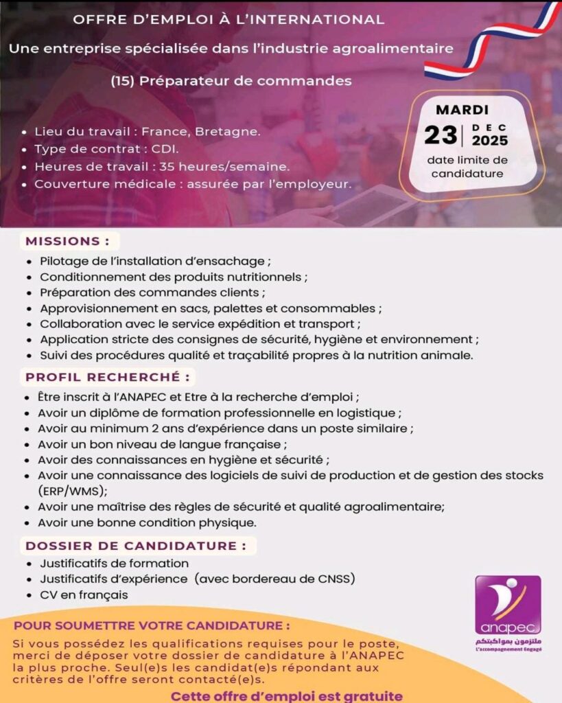 Les offres d’emploi proposées dans l’industrie agroalimentaire bretonne représentent une chance rare et sérieuse pour les candidats marocains désirant travailler à l’international. Les postes de Préparateur de commandes et Conducteur d’installations logistiques offrent des conditions stables, un environnement professionnel moderne et un véritable parcours de carrière.
