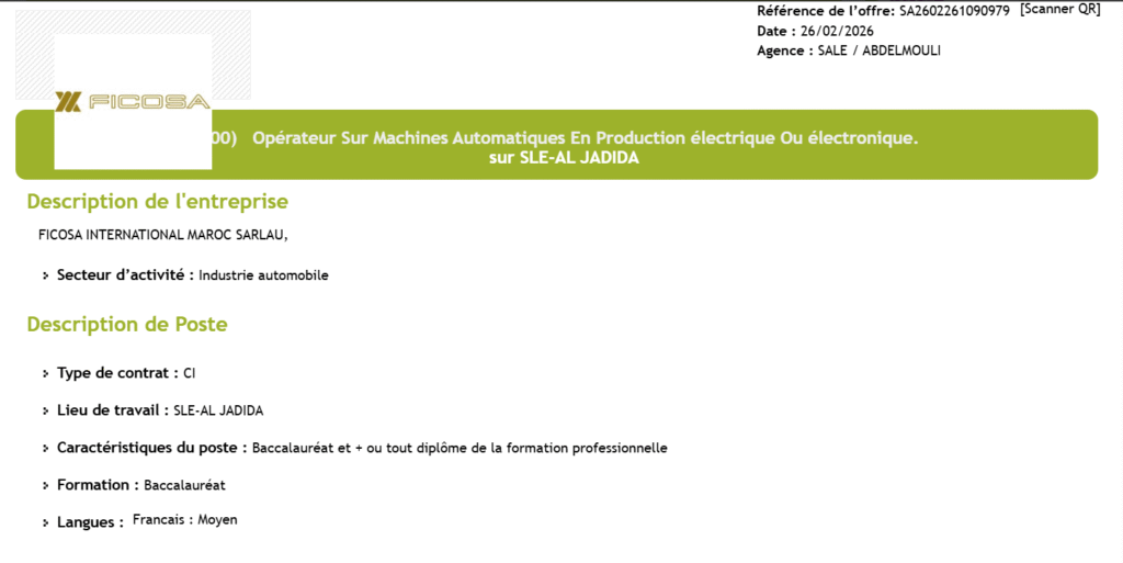 L’offre de recrutement lancée par FICOSA INTERNATIONAL MAROC SARLAU pour 100 opérateurs sur machines automatiques en production électrique ou électronique à SLE-AL JADIDA constitue une véritable opportunité professionnelle dans le secteur stratégique de l’industrie automobile au Maroc. Accessible aux titulaires d’un baccalauréat ou d’un diplôme de formation professionnelle, ce poste en Contrat d’Insertion (CI) permet d’acquérir une expérience concrète, de développer des compétences techniques recherchées et d’intégrer un groupe international reconnu. Si vous êtes motivé, rigoureux et prêt à évoluer dans un environnement industriel moderne, cette offre d’emploi pourrait marquer le début d’une carrière prometteuse.