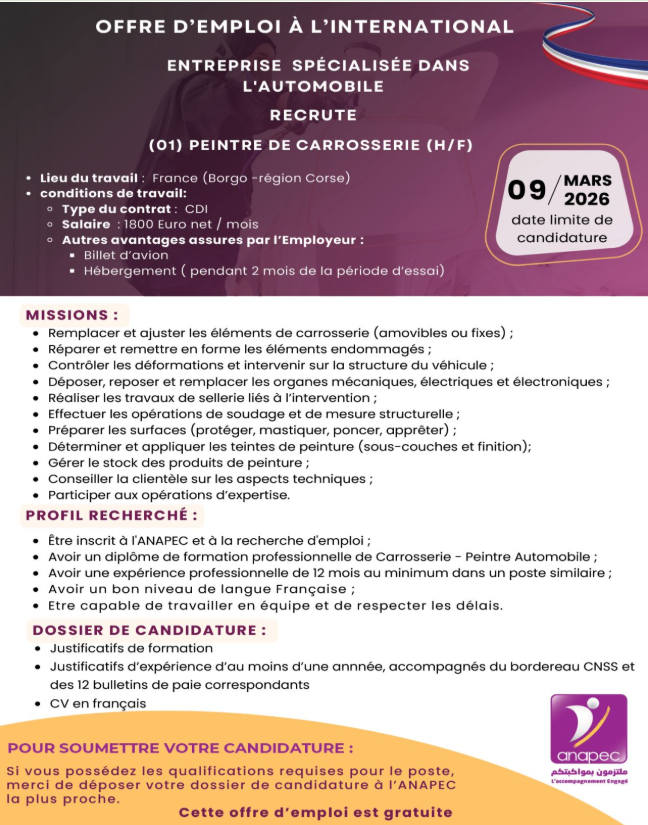 Cette offre d’emploi Peintre de Carrosserie en France constitue une opportunité rare pour les professionnels expérimentés souhaitant évoluer dans un environnement international. Avec un contrat CDI, un salaire de 1800 EUR par mois et la prise en charge du billet d’avion, elle représente une réelle perspective de stabilité et de progression.